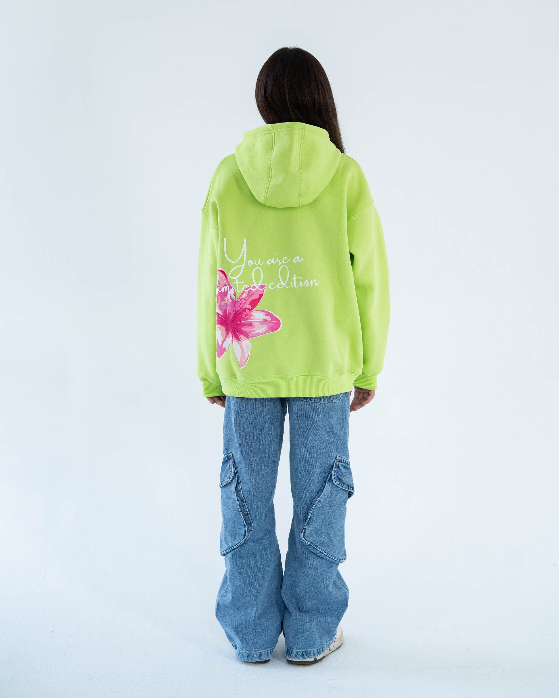 High-quality fleece-lined hoodie in a fresh lime color. Soft, cozy, and designed with a bold pink flower print and “You are a limited edition” statement on the back. Comfortable, durable, and perfect for everyday wear.